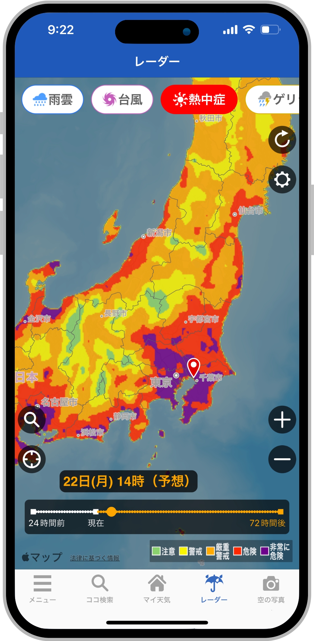 さらに、24時間先までの熱中症リスクを高解像度でマップ上に表示し、いつどこで危険なのか、熱中症のリスクをひと目で把握することができる「熱中症レーダー」も便利です。「熱中症情報」と併せてご活用ください。