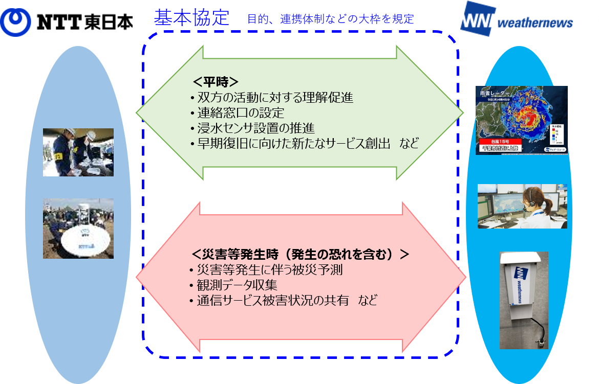 NTT東日本は、円滑かつ適切な災害対策の遂行に資することを目的として防災業務計画を掲げており、ウェザーニューズは、「いざという時、人の役に立ちたい」という原点の想いを胸に運営をしています。両社は相互に連携し、被災地域への貢献につなげていきます。